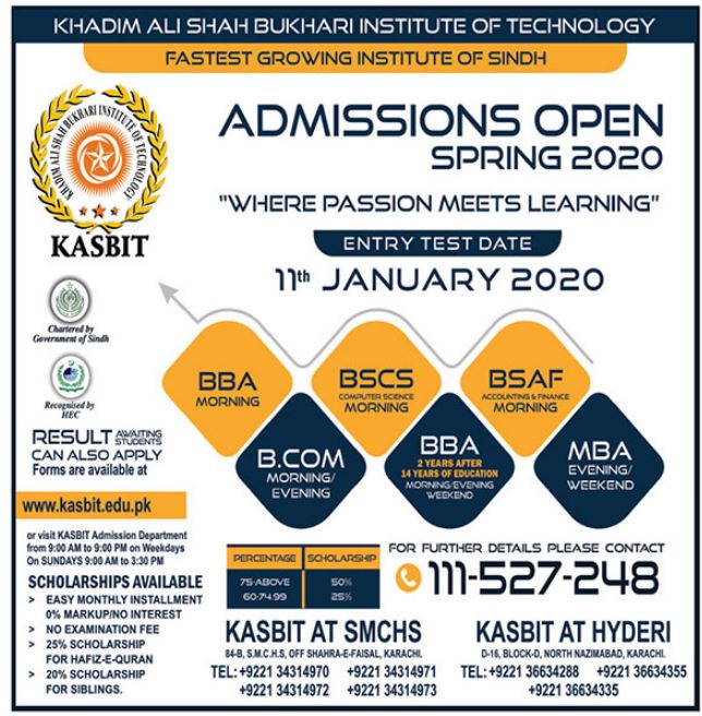 for the session of 2020. The Khadim Ali Shah Bukhari Institute of Technology has now starts the Admission in the BBA, BSCS, BSAF, BCOM, BBA, MBA. The entry test date will be held on 11th january, 2020.