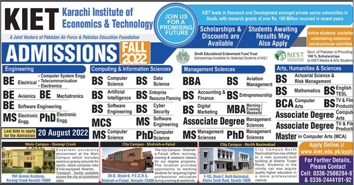 Khadim Ali Shah Bukhari Institute of Technology Karachi is going to offer the KASBIT Karachi Admissions 2022. KASBIT BS Admissions 2022 are announced in Computer Science, Software Engineering, Accounting and Finance Media Management, Accountancy and Taxation, KASBIT BBA Admissions 2022 are open for 4 & 2 Years, KASBIT MS Admissions 2022 are open in Management Sciences, KASBIT ADP Admissions 2022 are offering in Digital Marketing, Sales Management, Administrative and Office Management, Computer and Infrastructure & Networking, Commerce, Web & Software Development, KASBIT Karachi MBA Admissions 2022 are announced in Finance, Marketing, Supply Chain Management, HR & Organizational Psychology and KASBIT PhD Admissions 2022 are open in Management Sciences. Khadim Ali Shah Bukhari Institute of Technology Admissions 2022 are processing.