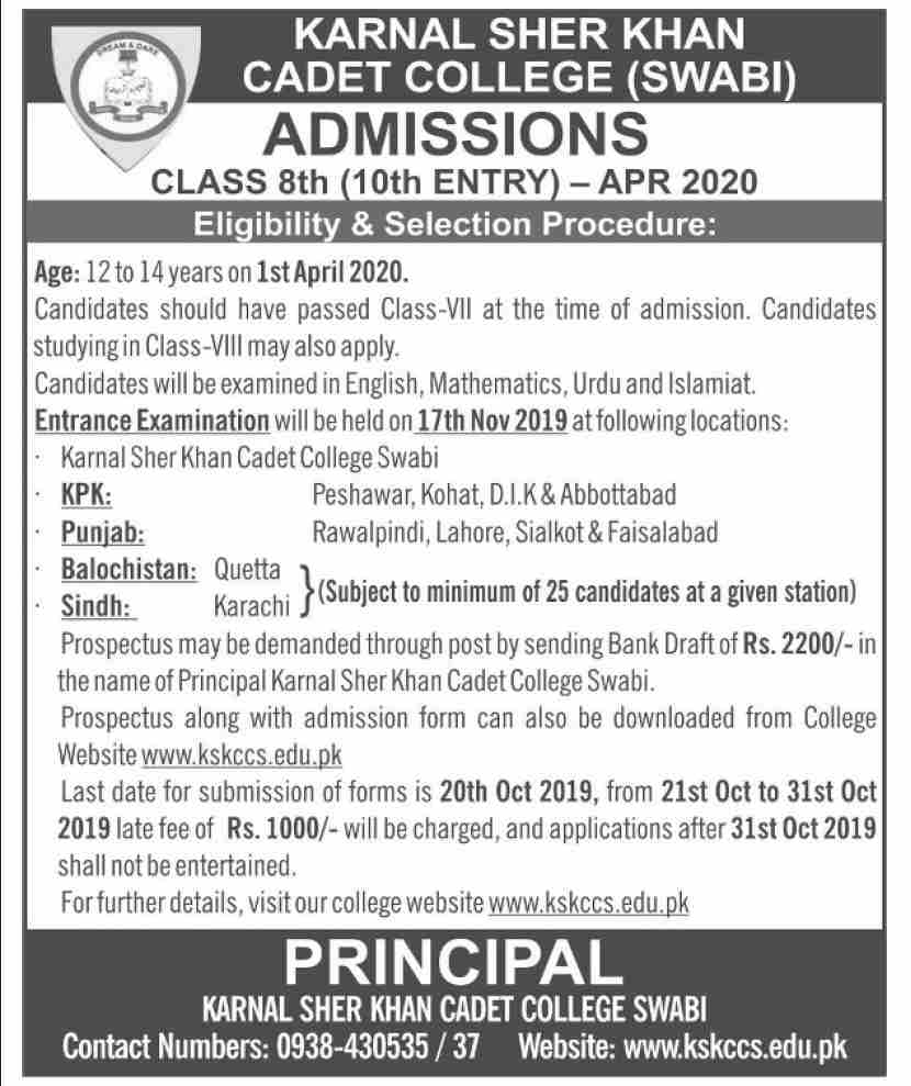 Kernal Sher Khan Cadet College Swabi has offered admissions for Class 8th. Last date to apply 31 Oct 2019. Entry Test 17 Nov 2019.