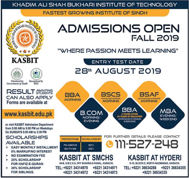 Khadim Ali Shah Bukhari Institute of Technology Karachi has offered admission for BBA, BSCS, BSAF, B.Com, MBA. Admission forms available at Website. Scholarships are available.