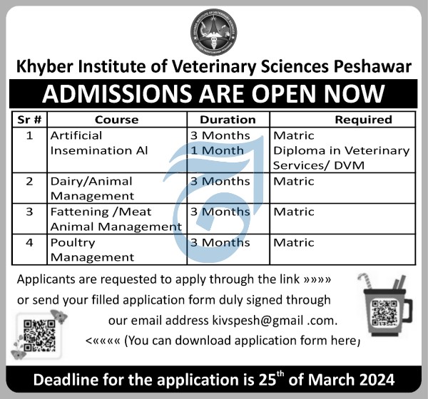 Khyber Institute of Veterinary Sciences KIVS in Peshawar has opened admissions for various courses in the year 2024, offering aspiring individuals an opportunity to enhance their skills and knowledge in the field of veterinary science. These courses cater to a range of interests and durations, providing flexibility and specialized training to meet the diverse needs of students.