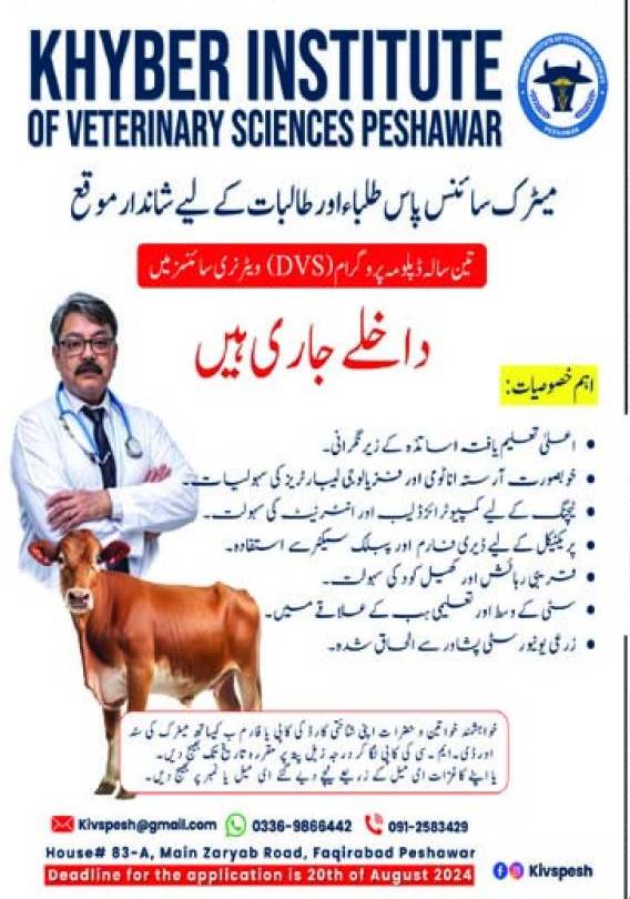 Dont miss the chance to pursue a rewarding career in veterinary sciences. Apply now for Khyber Institute of Veterinary Sciences Peshawar DVS Admissions 2024 and embark on a path to becoming a skilled and knowledgeable veterinary professional.