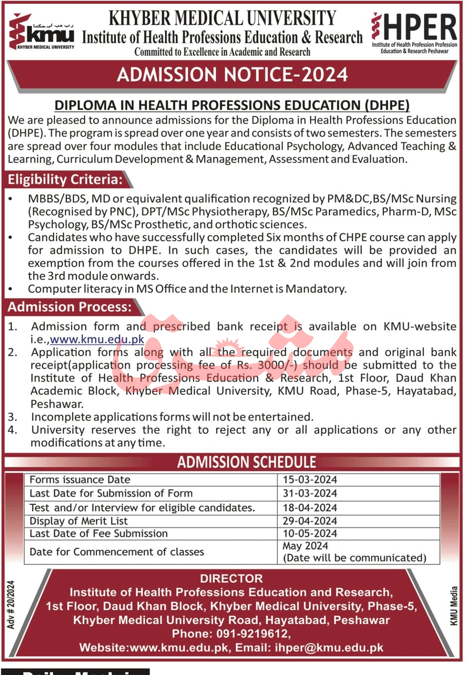 At Khyber Medical University, excellence is not just a goal but a tradition. Join a community of dedicated learners and renowned faculty committed to advancing healthcare education and practice. Seize this opportunity to shape your future and make a difference in the world of healthcare. Apply now and embark on a fulfilling journey toward professional growth and success.