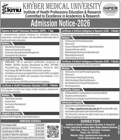 The Institute of Health Professions Education & Research IHPER at Khyber Medical University KMU has officially announced its admissions 2026 for a variety of specialized diploma and certificate programs. These courses are strategically designed to enhance the pedagogical, research, and technological capabilities of healthcare professionals and educators in Pakistan.