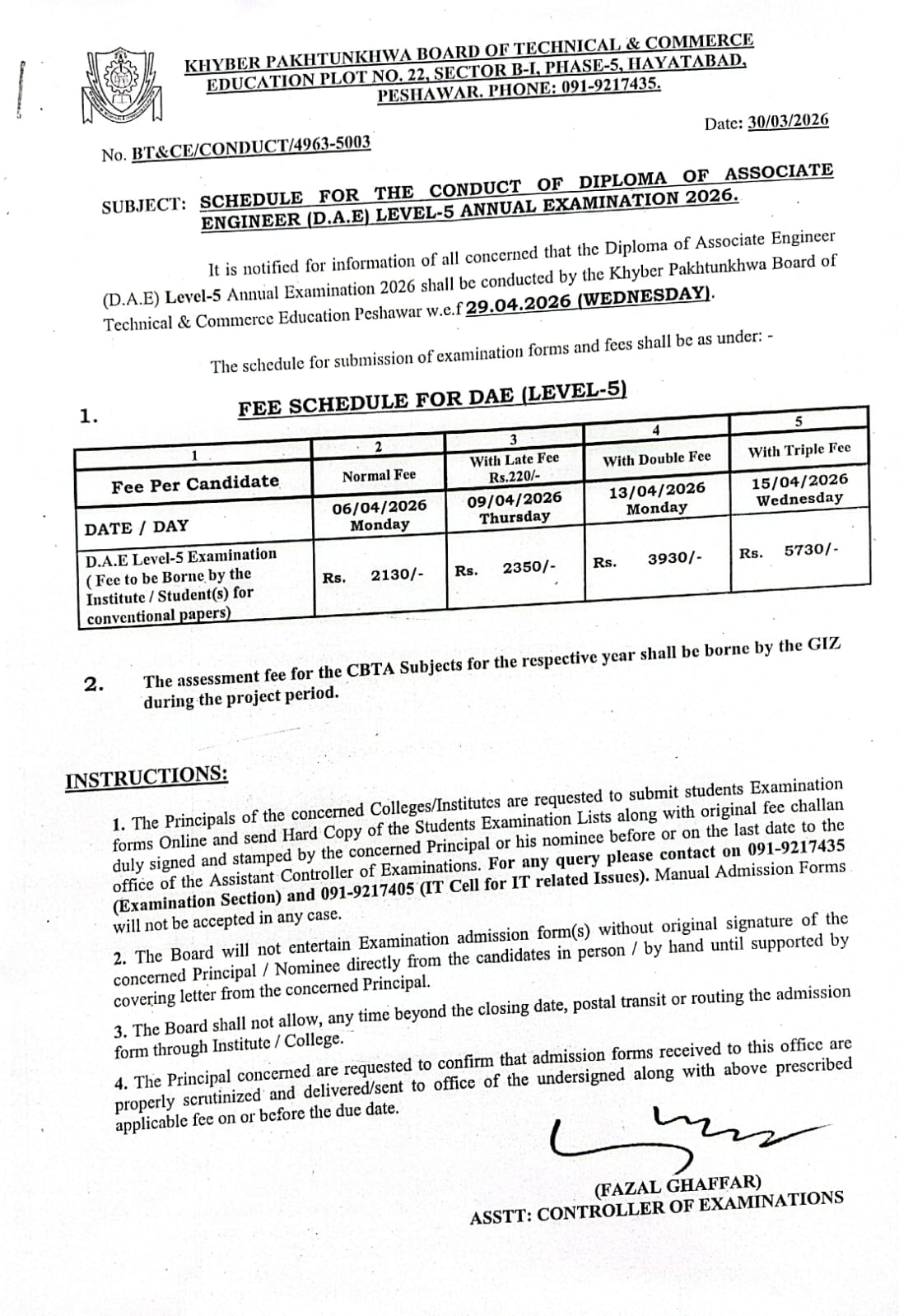 Khyber Pakhtunkhwa Board of Technical & Commerce Education, Peshawar, has scheduled the start of the D.A.E. Level-5 Annual Exams for Wednesday, April 29, 2026. All affiliated technical colleges and institutes are required to finalize student registrations according to the tiered fee structure and strict administrative protocols outlined by the KPBTE Board. The students can get the latest updates of KPBTE 2026 Annual Exams for Diploma of Associate Engineer Level-5.