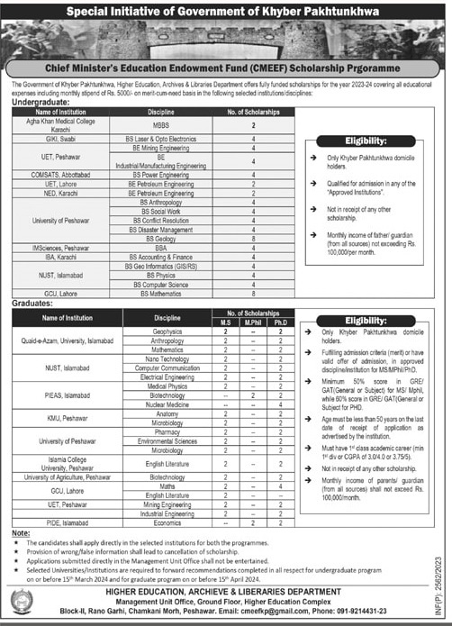 The Government of Khyber Pakhtunkhwa is pleased to announce the Chief Ministers Education Endowment Fund Scholarship for the year 2024. This scholarship program, known as CMEEF, is a fully-funded opportunity catering to both undergraduate and postgraduate students. It covers all educational expenses and offers a generous monthly stipend of PKR 5,000. CMEEF is a merit-cum-need based scholarship initiative administered by the Higher Education, Archives, and Libraries Department of the Khyber Pakhtunkhwa government. These scholarships are available for students pursuing BS, BE, MS, MPhil, and Ph.D. programs in selected subjects and institutions. The candidates can get the detailed information regarding Khyber Pakhtunkhwa Generous CMEEF Scholarship 2024.