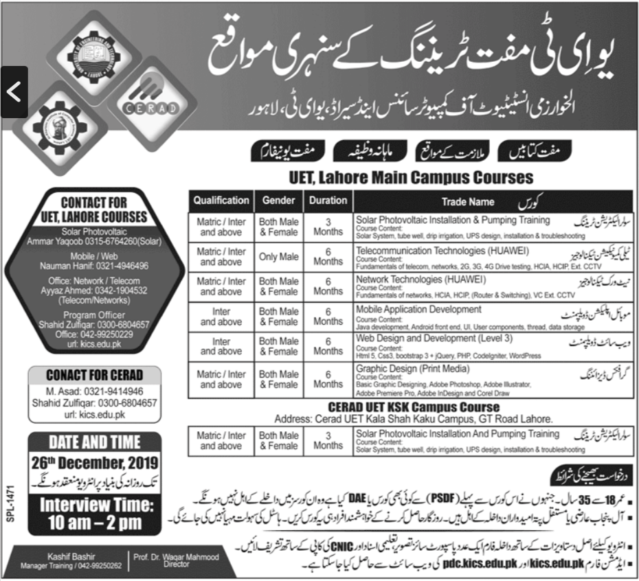 Al Khuarzami Institute of Computer Science & CERAD UET Lahore has announced admissions for Free Training Courses in Telecommunication Technologies, Network Technologies, Mobile Application Development, Web Design and Development, Graphic Design. Interviews will be held till 26 Dec 2019.
