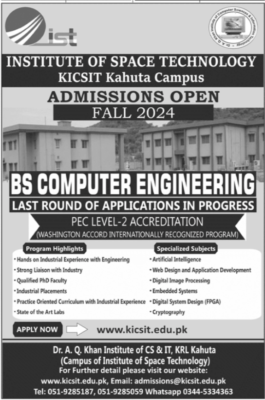 Dr. A. Q. Khan Institute of Computer Sciences and Information Technology KICSIT, a prominent institute of space technology located in Kahuta, is welcoming applications for Fall 2024. With PEC Level-2 Accreditation and a Washington Accord internationally recognized program, KICSIT Couses offers top-notch education in computer engineering.
