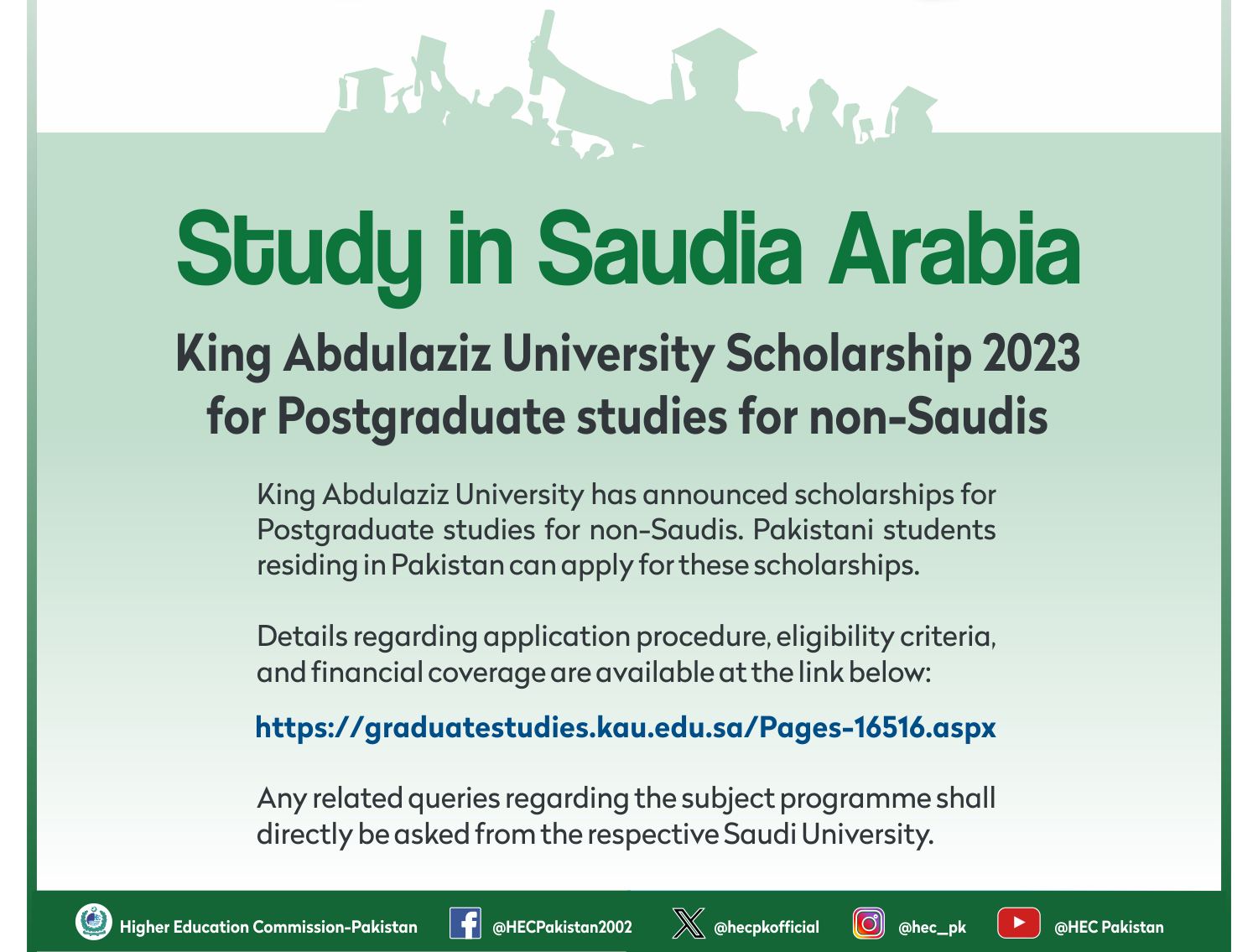 Aspiring candidates can stay informed about the latest developments regarding the King Abdulaziz University Masters Scholarships 2023 for Non-Saudis. Detailed information, including the application process, eligibility criteria, and financial coverage of the scholarship, can be accessed through the official website of the Higher Education Commission HEC. This valuable resource provides comprehensive insights for international students aspiring to benefit from this scholarship opportunity.