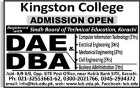 Kingston College Karachi has announced admissions for DAE in Computer Information Technology, Civil Engineering, Mechanical Engineering, Electrical Engineering, DBA Diploma in Business Administration.