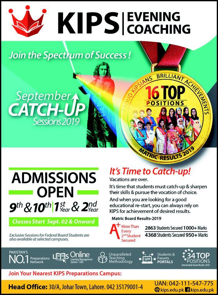 KIPS Lahore has announced admissions for 9th, 10th, Inter-1, 2. Classes will start 02 Sep & onward. Evening Coaching.