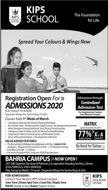 KIPS School Admission 2020 announced for the class of Play Group to Matric. The Students can get their Admission form From the Kips School. The Classes will Starts 1st Week of March.