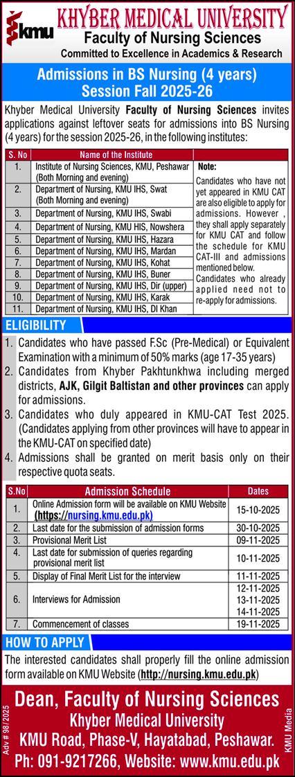 Khyber Medical University KMU, a premier medical institution in Pakistan, is pleased to announce admissions on leftover seats for the BS Nursing 4-Year Program for the Fall 2025-26 session. Applications are invited from eligible candidates for enrollment in various KMU-affiliated Nursing Institutes across Khyber Pakhtunkhwa.