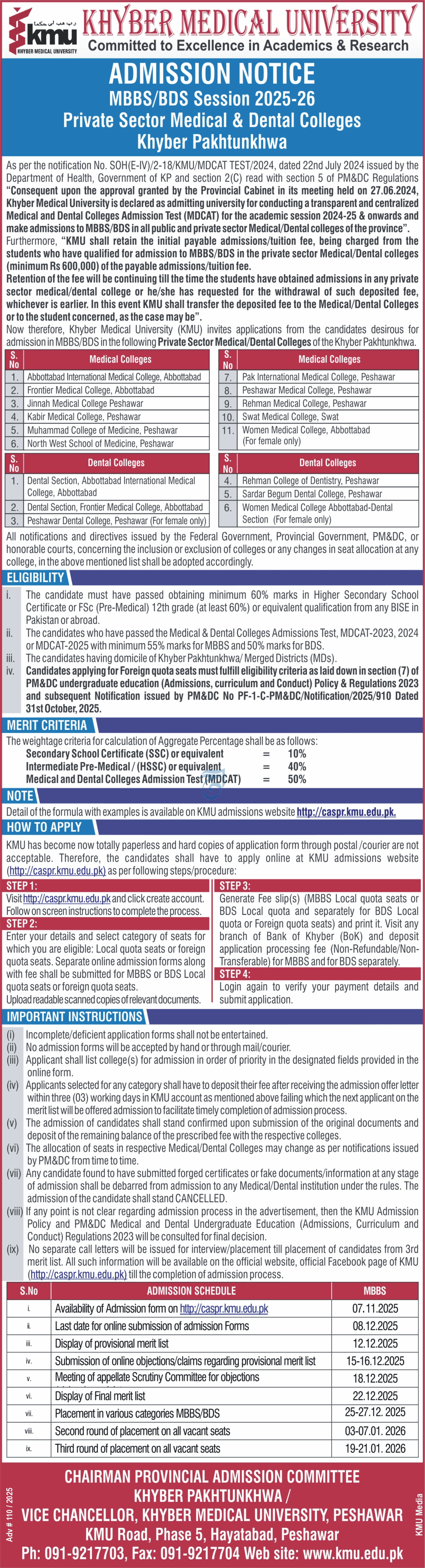 Khyber Medical University KMU, Peshawar — under the notification No. SOH E-IV/2-18/KMU/MDCAT TEST/2024, dated 22nd July 2024, issued by the Department of Health, Government of Khyber Pakhtunkhwa — has been designated as the admitting university for conducting a transparent and centralized Medical and Dental Colleges Admission Test MDCAT and managing admissions to MBBS/BDS programs in all public and private sector medical and dental colleges of the province.