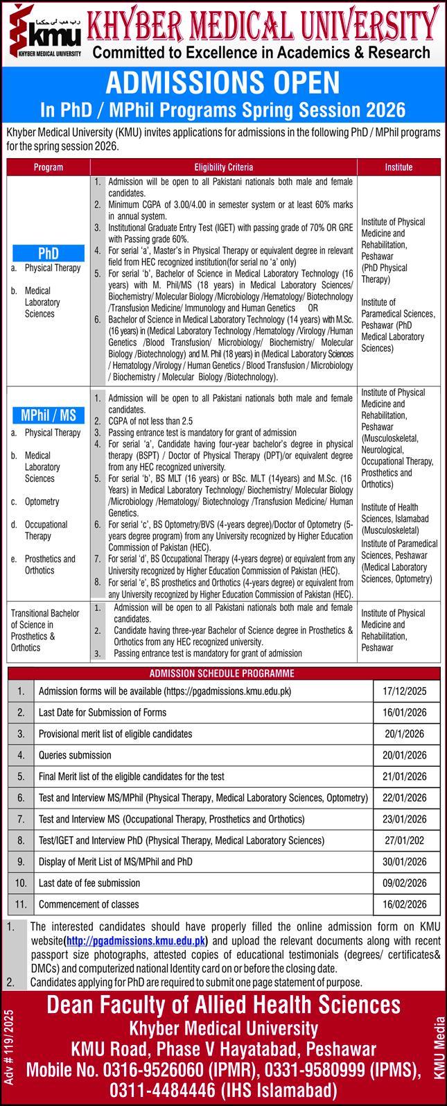 Khyber Medical University KMU, committed to excellence in academics and research, invites applications for PhD and MPhil/MS programs for the Spring Session 2026. Admissions are open to all Pakistani nationals, both male and female candidates.