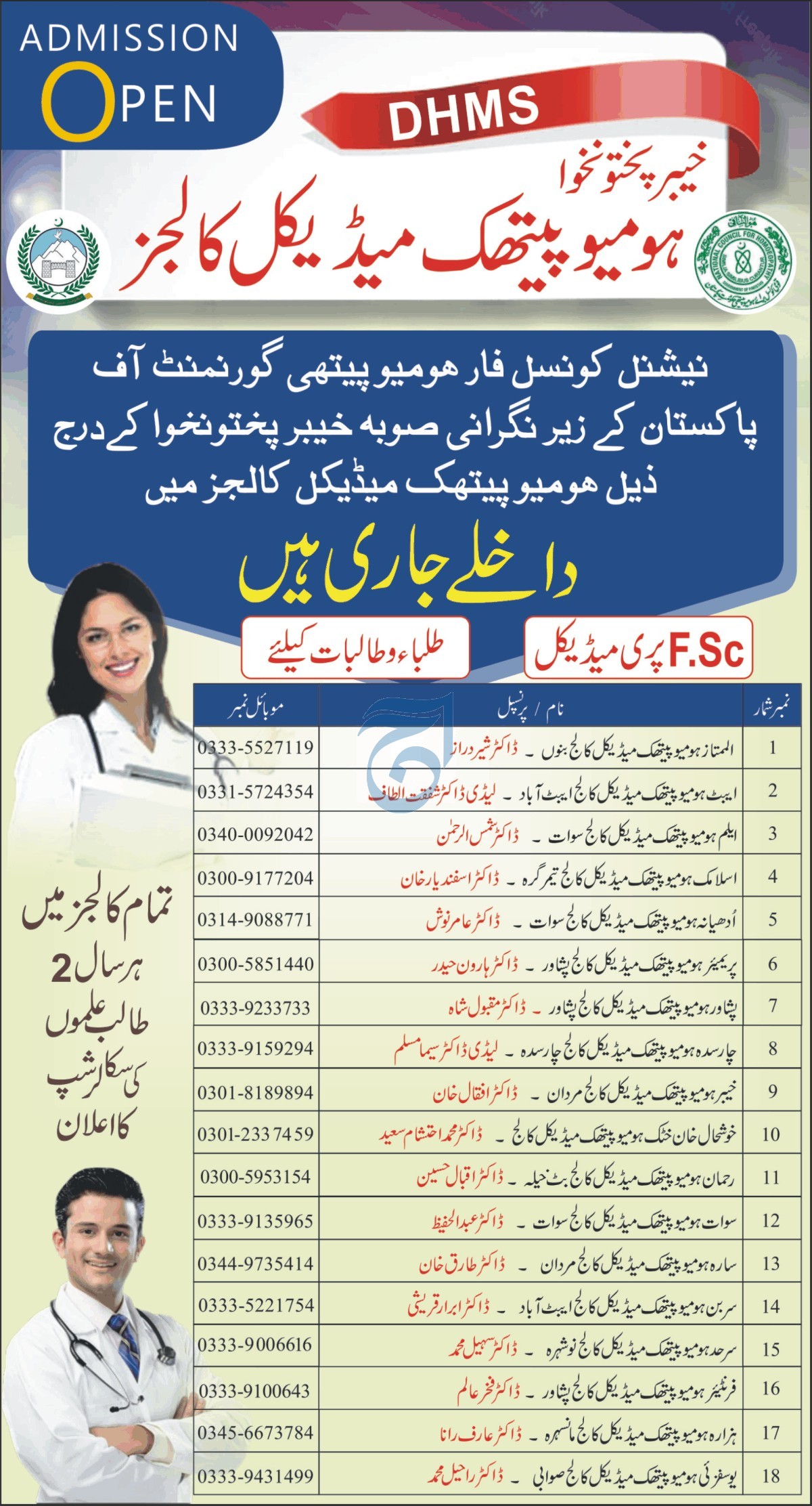 Admissions are open in various Homeopathic Medical Colleges in Khyber Pakhtunkhwa in the year 2022. The eligibility criteria for admission is Fsc with pre-medical. Scholarships are also being offered by each college. Candidates who want to take admission can contact the college of their choosing in the ad below.