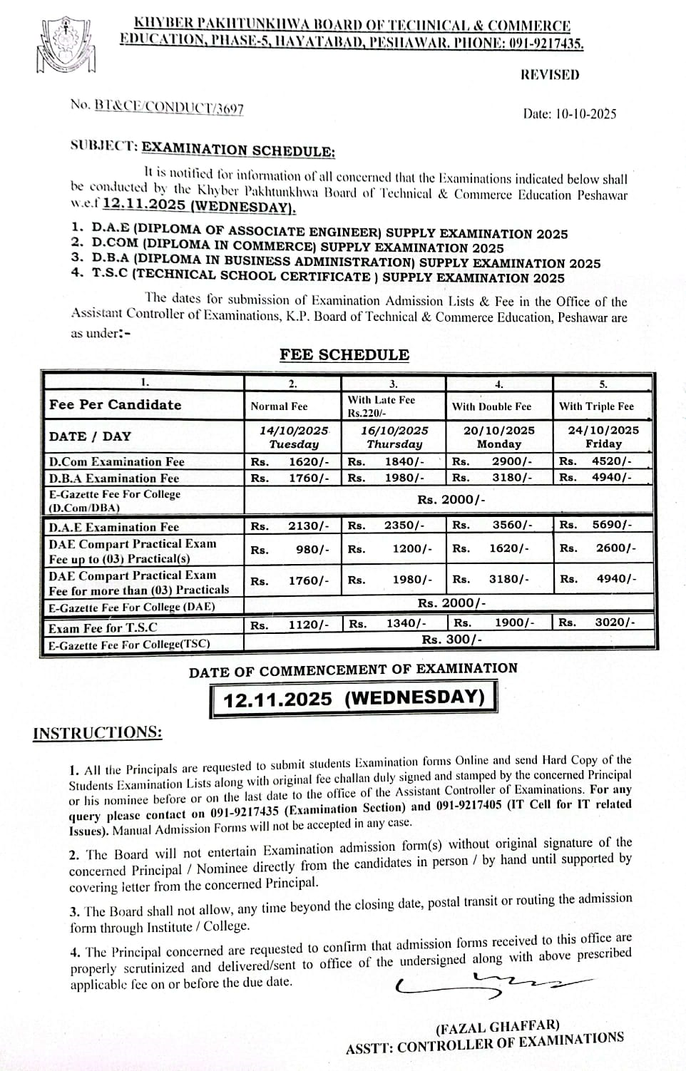 Peshawar, Khyber Pakhtunkhwa Board of Technical Education Peshawar is going to start their supply exams of the Diploma of Associate Engineer, Diploma in Commerce, Diploma in Business Administration and Technical School Certificate programs. The exams section of KPBTE has shared the KPBTE Diploma Courses Supply Exams 2025 Forms Schedule for the students to submit their application forms and payment of fee so that they can be able to appear in the next coming exams of these technical programs.