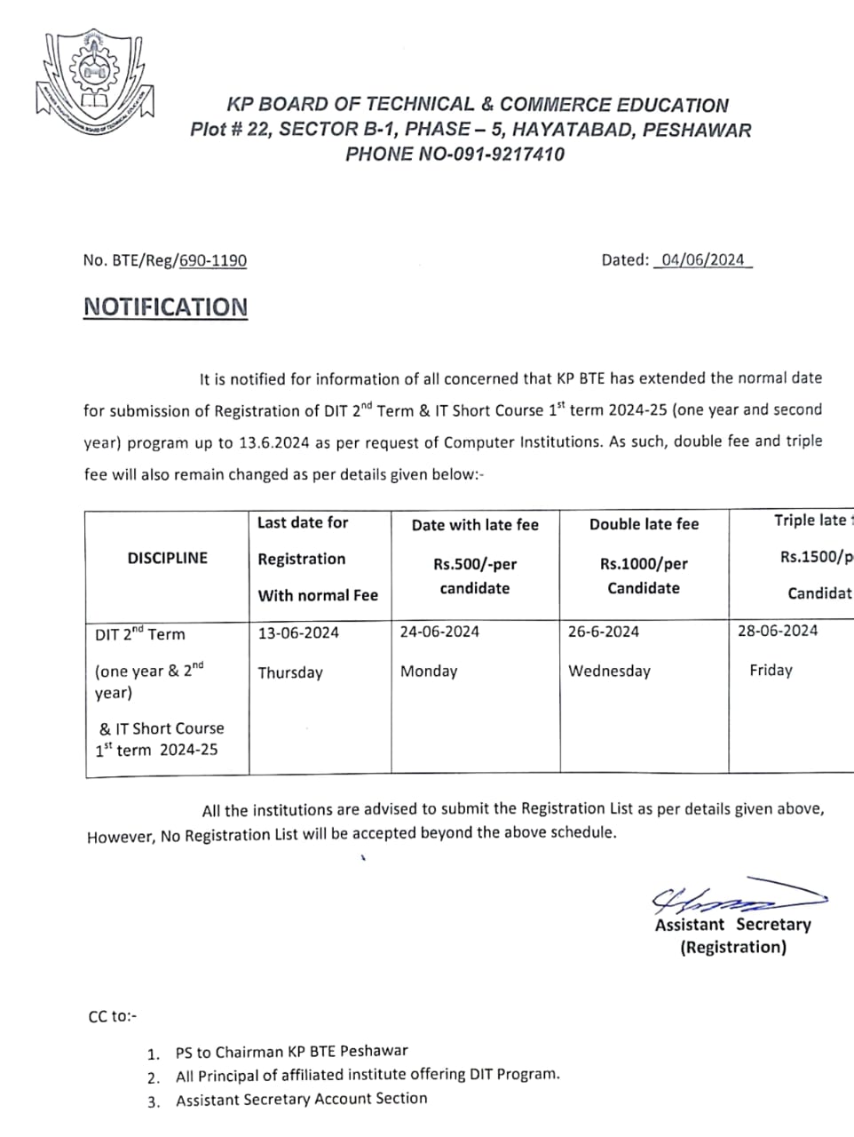 Peshawar, Khyber Pakhtunkhwa Board of Technical Education Peshawar has announced the registration schedule for the Diploma of Information Technology and Information Technology short courses 1st term 2024-25. After the completion of the course, the KPBTE has announced the KPBTE DIT & IT Short Courses Registration 2024-25 Schedule for the submission of the registration forms and payment of registration fee so that the candidates can become eligible to attend the exams of the concerned diploma or short course.