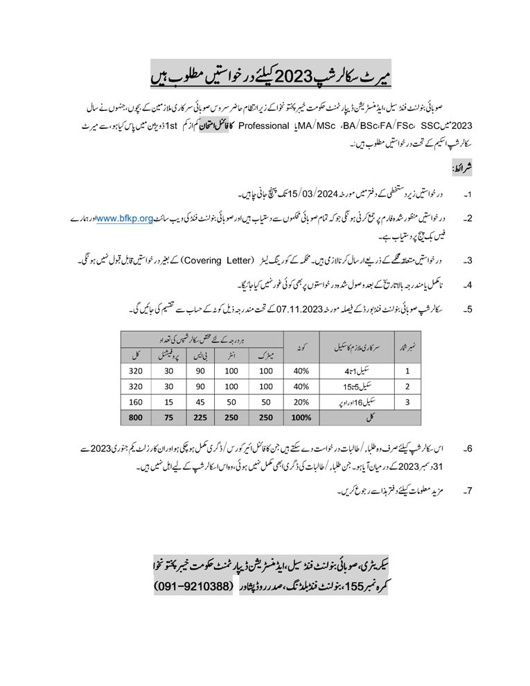 Benevolent Fund Khyber Pakhtunkhwa introduces merit scholarships exclusively for the children of KP Government employees, spanning from Matriculation to post-graduation. A total of 800 scholarships will be awarded based on merit, and applications are invited from students who have achieved 1st Division in the SSC, Inter, Bachelor, and Professional degree exams of 2023. The latest updates of KPK Benevolent Fund Merit Scholarship Opportunity are shared to the students for their information.