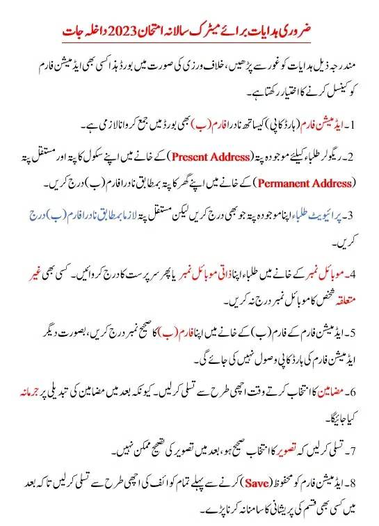 Peshawar, Boards of Intermediate and Secondary Education located in Khyber Pakhtunkhwa province manage the KPK Board SSC class annual exams 2023. The KPK Boards issue the special instructions to the students allowing them to appear in their coming exams. The candidates will follow their KPK Boards Matric Annual Exams 2023 Special Instructions otherwise their application forms can be cancelled. The candidates will attach Form ‘B’ issued by NADRA with admission forms. The candidates will mention the school address, permanent address in present address. The candidates will mention the mobile phone of their own or their guardian and do not mention the mobile phone of any irrelevant person. The candidates will read all necessary instructions carefully and in case of any mistake or wrong entry, their application forms may be cancelled.