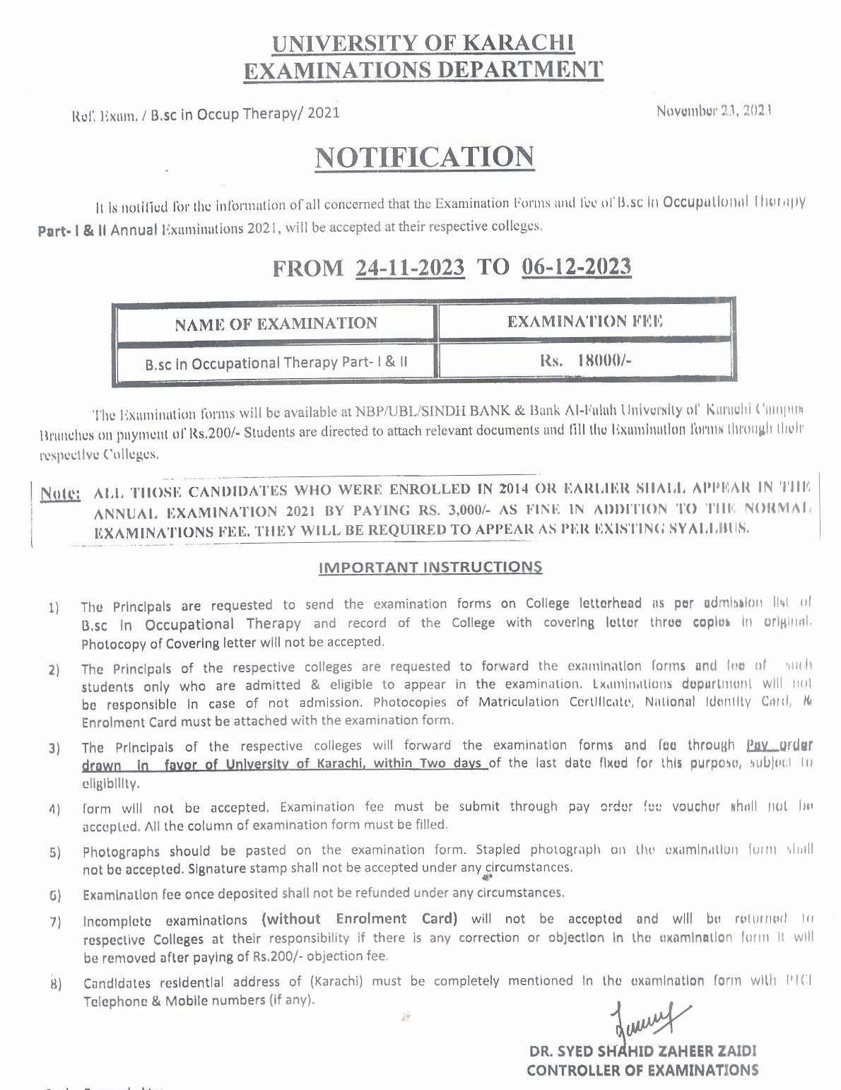Students enrolled in 2014 or earlier are granted the opportunity to participate in these exams by paying a nominal fine of Rs.3,000/- in addition to their examination fee. This provision allows eligible individuals to continue their academic journey and take part in the BSc Occupational Therapy Annual Exams 2021 at the University of Karachi.