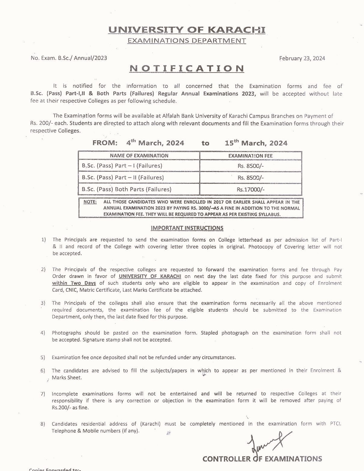 Karachi, University of Karachi is going to manage their UoK BSc Regular Annual Exams 2023 for the desired students. The exams department of Karachi University is accepting the application forms from the students for their BSc Pass Part 1 and 2 and both parts Failure regular annual exams 2023. The students will follow their KU BSc Regular Annual Exams 2023 Forms Schedule and they can submit their application forms from 04-03-2024 to 15-03-2024 without late fee.