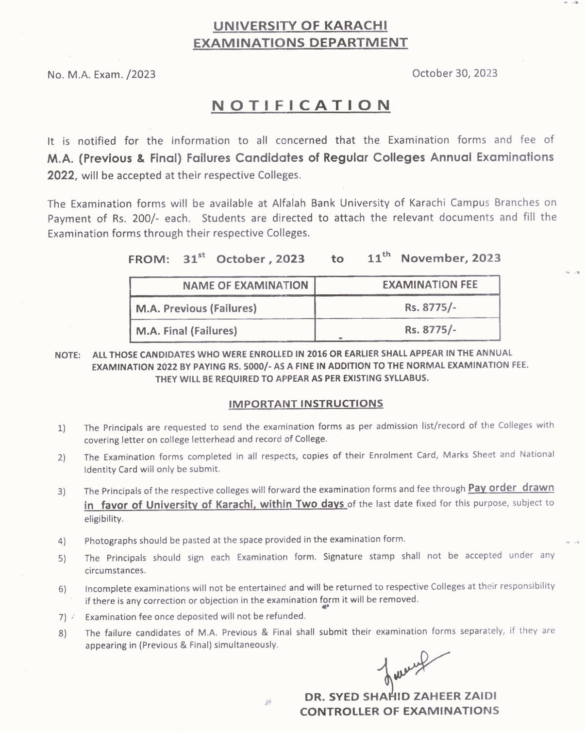 University of Karachi UoK is gearing up to conduct the MA Previous and MA Final annual exams for 2022, specifically targeting students from regular colleges who faced prior academic setbacks. To facilitate this process, the Karachi University exams department is now actively accepting admission forms from eligible students, allowing them to participate in the upcoming exams sessions.
