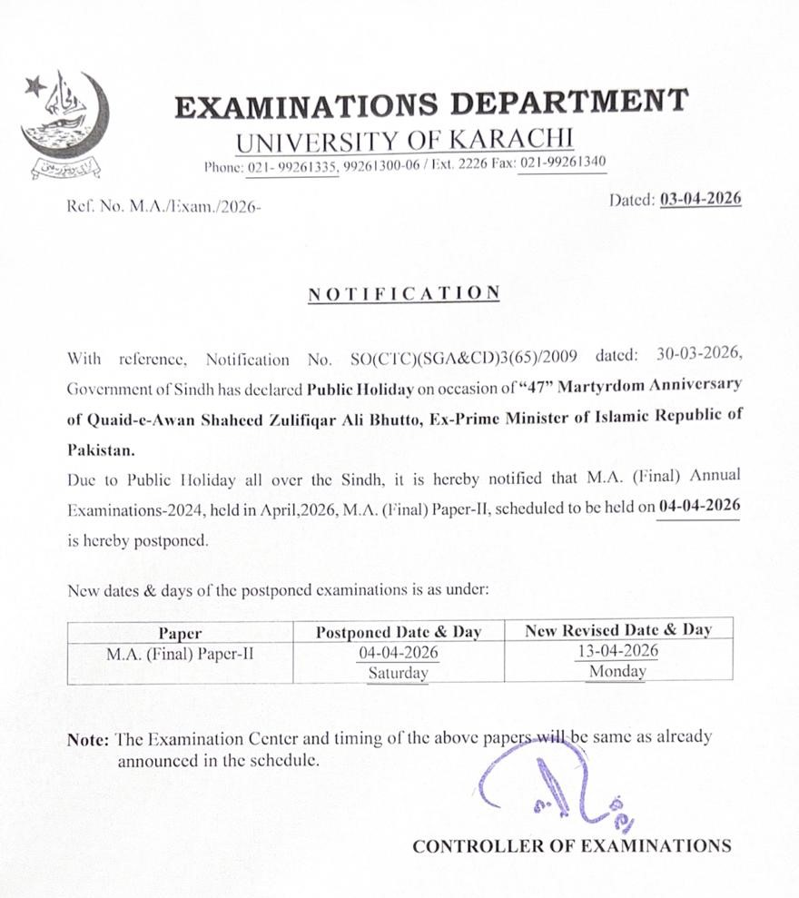 Due to this public holiday across Sindh, the MA Final Paper-II exam, originally scheduled for 04 April 2026 Saturday, has now been postponed.