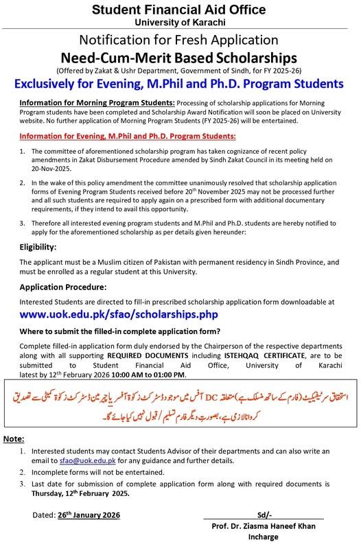 The Student Financial Aid Office at the University of Karachi KU is inviting applications for the need-cum-merit based scholarships specifically for students enrolled in evening programs, M.Phil, and Ph.D. programs. Scholarship applications for morning program students have already been processed, and updates regarding their status will soon be available on the University of Karachi website. However, applications for evening program students will not be accepted beyond 20th November 2025. The students can get the latest updates of UoK Fresh Applications for Need-Cum-Merit Based Scholarships for Evening, M.Phil, & Ph.D. Students.