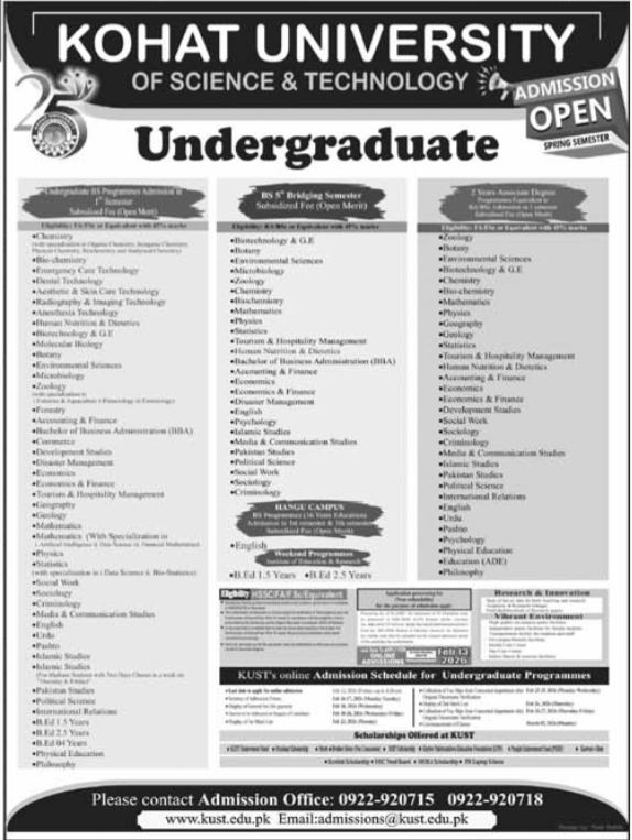 Kohat University of Science & Technology KUST has announced undergraduate admissions for the Spring Semester, offering a wide range of BS and education degree programs at its main campus and Hangu Campus. The university continues its mission of providing quality education in science, technology, social sciences, and professional disciplines.