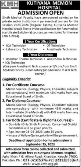 Kutiyana Memon Hospital Admission 2023 Offers Paramedical Courses,Kutiyana Memon Hospital KMH, a prominent healthcare institution, is inviting applications for various paramedical courses for the academic session 2023-2024. The Sindh Medical Faculty has officially announced admissions for private sector institutions, and KMH is keen on providing aspiring individuals an opportunity to pursue careers in healthcare through their certificate and diploma programs.