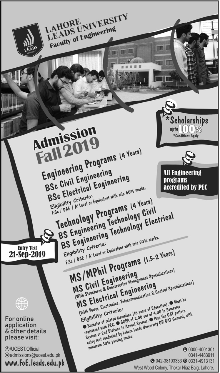 Lahore Leads University has announced admissions for BS in Civil Engineering, Electrical Engineering, BSc in Civil Engineering, Electrical Engineering, MS/M.Phil in Civil Engineering, Electrical Engineering. Scholarship are available. Entry test on 21 Sep 2019.