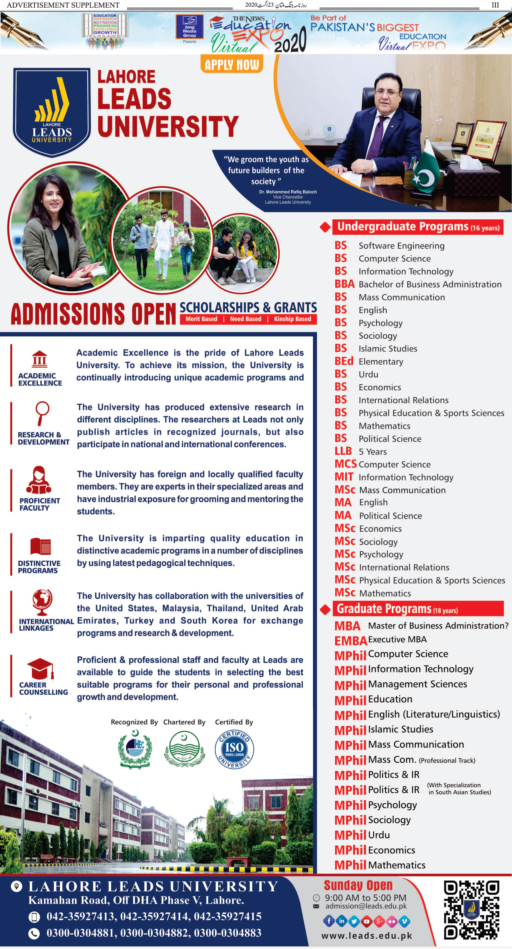 Lahore Leads University is offering admissions 2020 in BS Software Engineering, BS Computer Science, BS Information Technology, BBA, BS Mass Communication, BS English, BS Psychology, BS Islamic Studies, BS Urdu, BS Economics, BS IR, BS Physical Education, BS Maths, BS Political Science, LLB, MCS, MIT, M.Sc Mass Communication, Economics, Psychology, MBA, EMBA, M.Phil in Lahore.