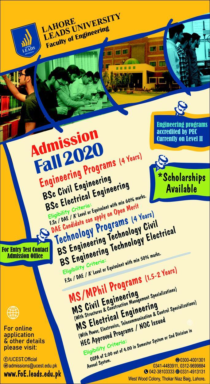 Lahore Leads University invites applications for admissions 2020 in B.Sc Civil Engineering, B.Sc Electrical Engineering, BS Engineering Technology Civil, BS Engineering Technology Electrical, MS Civil Engineering, MS Electrical Engineering in Lahore.