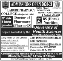 Lahore Pharmacy College has offered admissions 2020 for BS Hons in Nutrition, Doctor of Pharmacy Pharm D. Apply online for admission from college website. Admissions are open.
