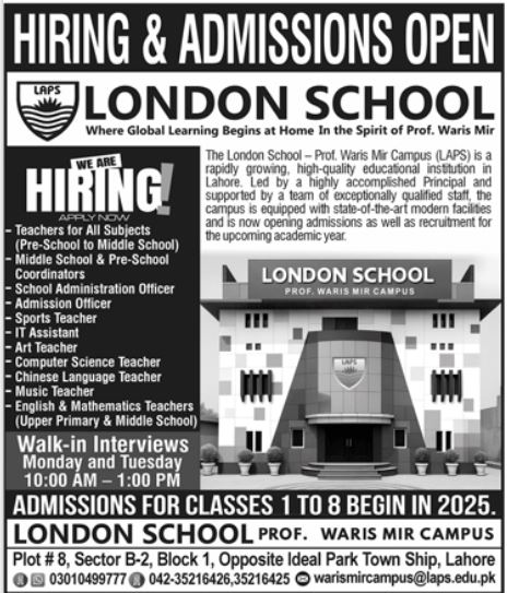 The London School — Prof. Waris Mir Campus LAPS in Lahore, inspired by the vision of Prof. Waris Mir, is a rapidly growing, high-quality educational institution. Equipped with state-of-the-art facilities and led by a highly accomplished Principal with a team of exceptionally qualified staff, LAPS is now inviting applications for admissions and recruitment for the upcoming academic year.