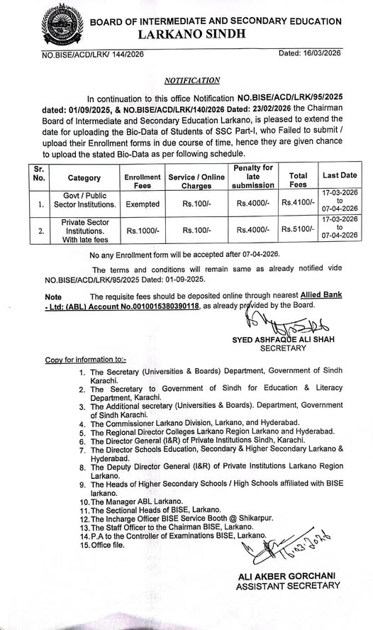 According to the Larkana Board, a special opportunity has been provided to students who were unable to upload their biodata earlier. The board has extended the schedule, allowing such candidates to complete their online biodata submission through the official portal. This facility will remain available from 17th March 2026 to 17th April 2026, giving students sufficient time to fulfill the requirement.