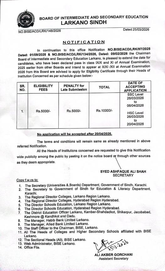 Board of Intermediate and Secondary Education Larkana has outlined its requirements for students who previously completed their 9th, 10th, or 11th class examinations in 2025 under a different board and now wish to appear in the 2026 examinations through Larkana Board. Such candidates are required to obtain an eligibility certificate before they can register for the upcoming exams. The board had earlier instructed these students to submit their application forms along with the eligibility certificate to secure permission for participation in the exams. Recently, the BISE Larkana Board has extended the deadline, giving applicants additional time to complete this requirement. Students are advised to stay updated with the latest notifications regarding the eligibility certificate process. The students can check the latest updates of Larkana Board Issues Updated Deadline for Eligibility Certificate 2026.