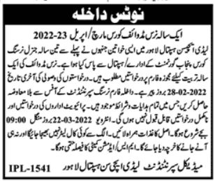 Lady Aitchison Hospital Lahore LCCI is apprising to Female who have done 3 years General Nursing Diploma Course from Punjab Government Institute / Hospital that they are invited on prescribed forms for LCCI Nurse Mid Wife Training Admissions 2022. Applications should be completed in all respect and should sent on or before February 28, 2022 for Lady Aitchison Hospital Training Course Admissions 2022. Interviews will be held on March 22, 2022 at 09:00 am. Lady Aitchison Hospital Nurse Mid Wife Admissions 2022 are ongoing.