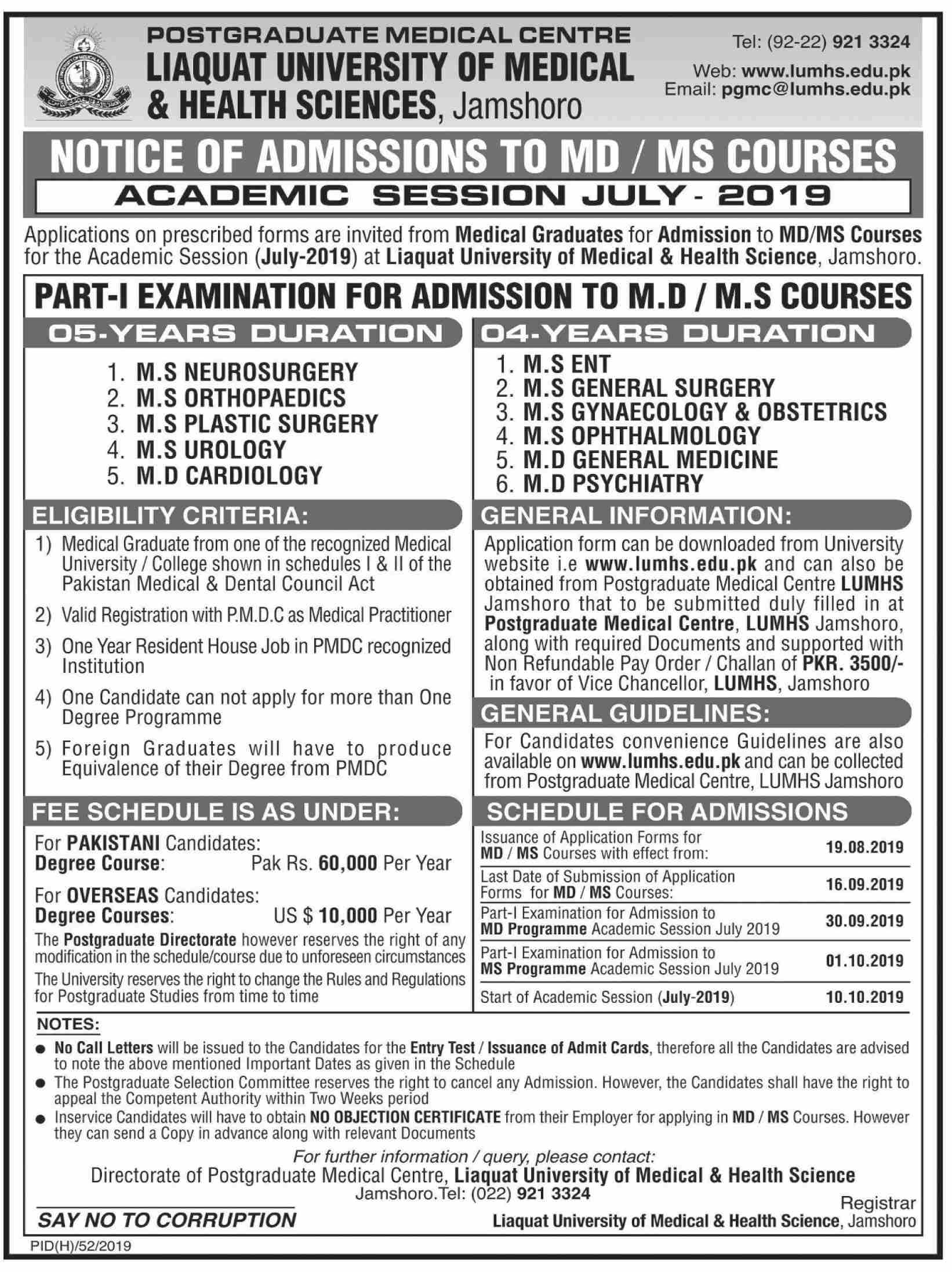 Liaquat University of Medical & Health Sciences Jamshoro announced admission for MS in Neurosurgery, Orthopaedics, Plastic surgery, ENT, General surgery, Ophthalmology, Urology, MD in Cardiology, General medicine, Psychiatry.
