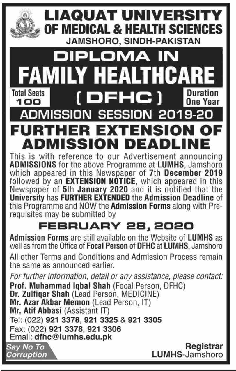 Liaquat University of Medical & Health Sciences Admission 2020 announced the Diploma in Family Healthcare DFHC of session 2019-20. Admission forms are still available of the Website of LUMHS. The Last date of submission of Admission form is 28th February 2020.