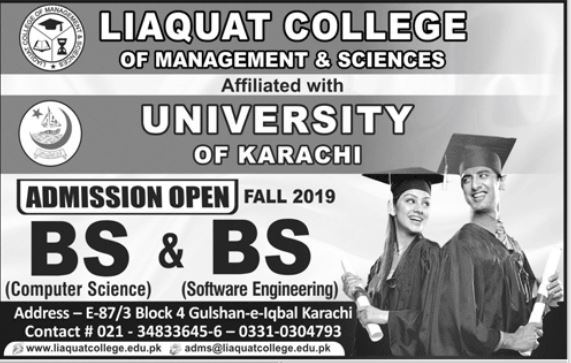Liaquat college of Science and Management has announced admissions in BS Computer Science and Software Engineering in Karachi.