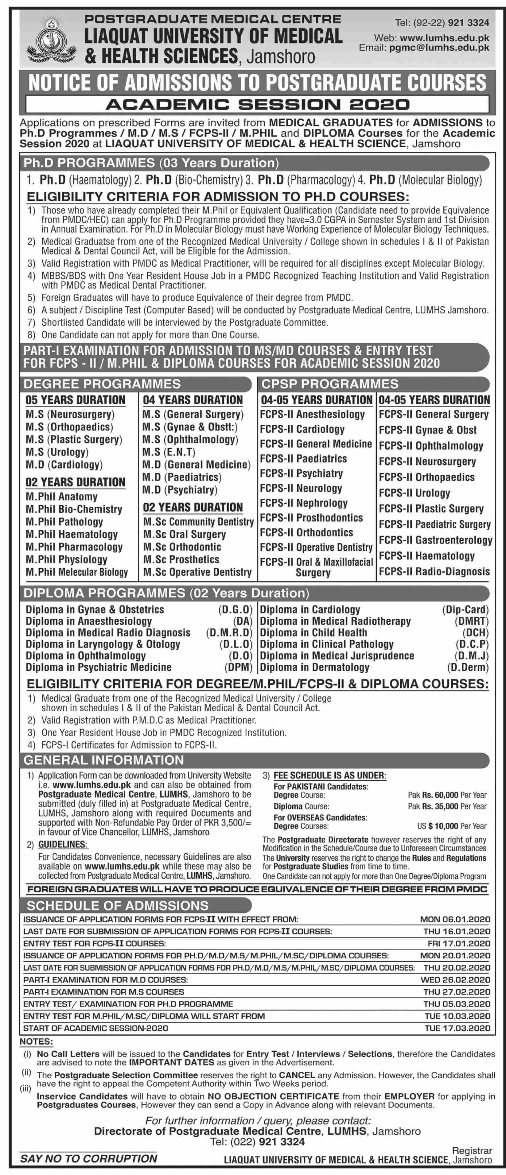 Liaquat University of Medical & Health Sciences Jamshoro announced the admission for the session of 2020. The Liaquat University of Medical & Health Sciences Jamshoro has now starts the admission in the PhD Programmes, Degree Programs, CPSP Programmes, Diploma Programmes. Last date for Submission of Application forms for FCPS Courses is 16th January, 2020.