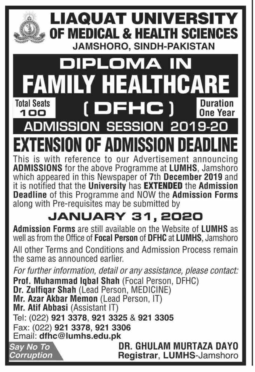 Liaquat University of Medical Health Sciences jamshoro announced the admission for the session of 2020. The Liaquat University of Medical Health Sciences jamshoro has now starts the admission in the Diploma