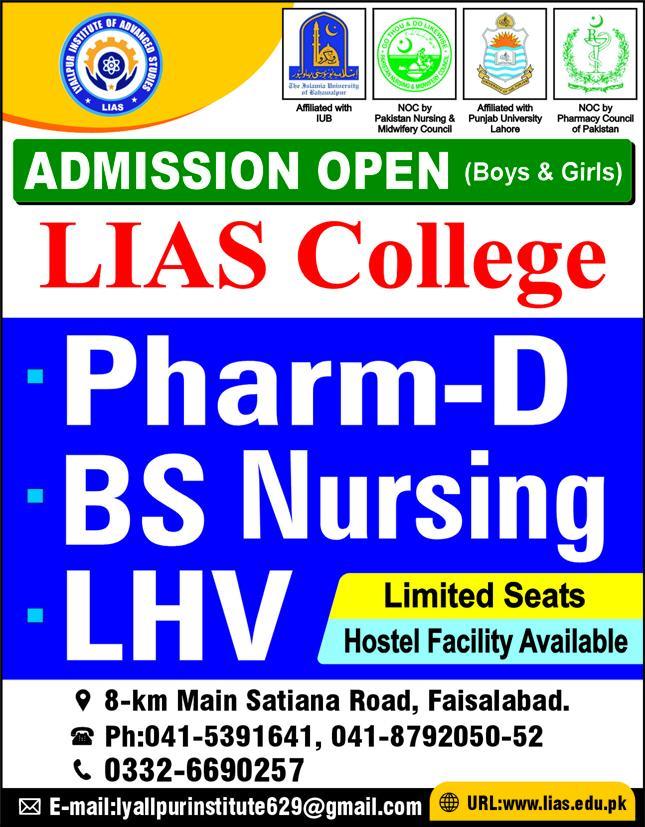 The Lyallpur Institute of Advanced Studies LIAS, also known as LYA – The Lasersity, is proud to announce that admissions 2025 are now open for boys and girls in the following prestigious programs: