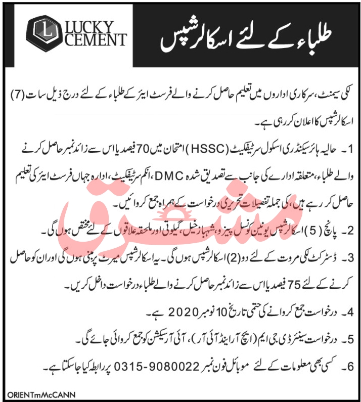 Lucky Cement has announced the Scholarships for those students who have studying in Government Colleges and get 70% or above marks on First year 11th annual examinations. 5 Scholarships is for Union Council Peezo, Shahbaz Khel, Geloti and 3 Scholarships is on Open Merit for Laki Marwat. The last date for submission of application is 10 November 2020.