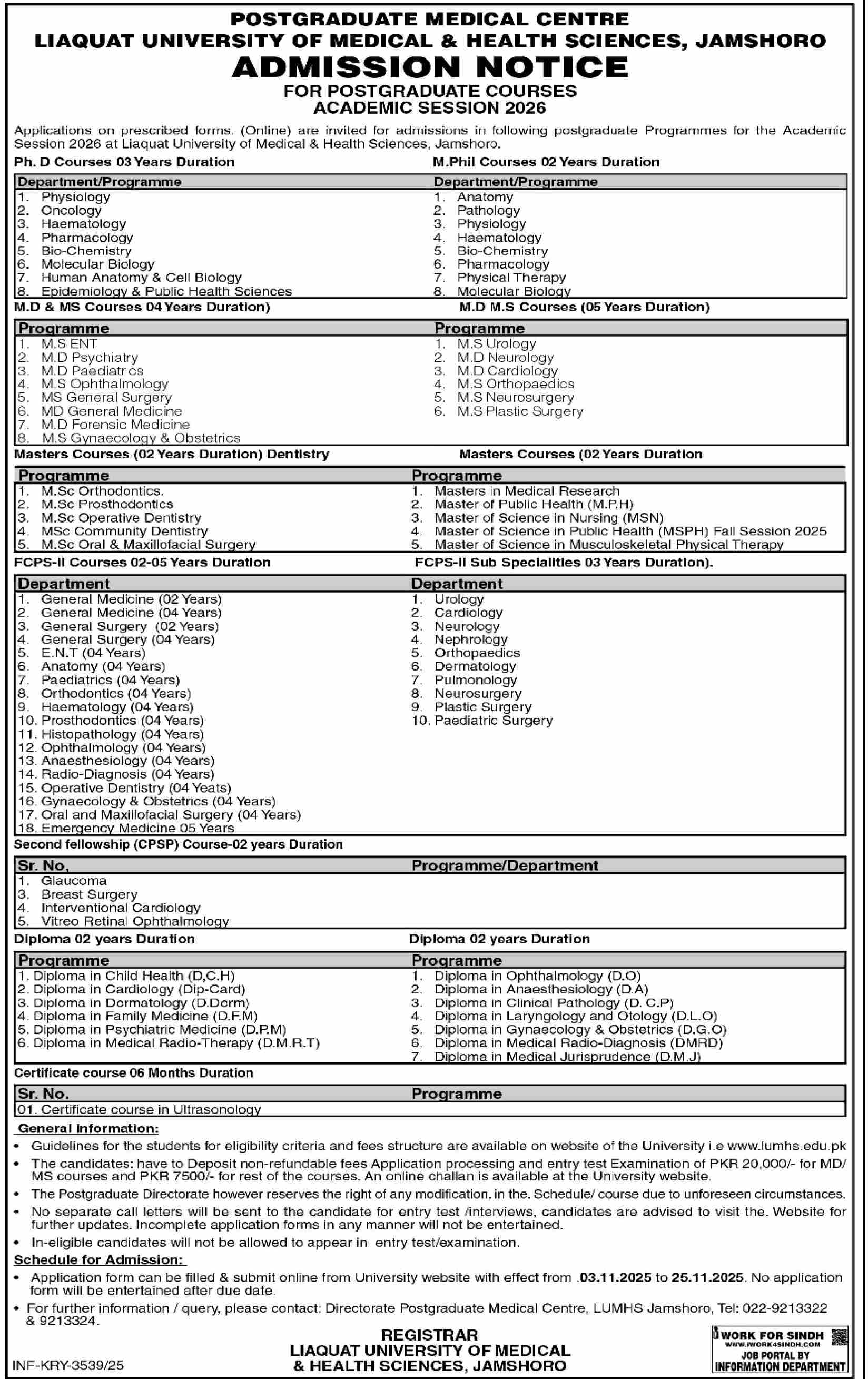 The Liaquat University of Medical & Health Sciences LUMHS, Jamshoro, through its Postgraduate Medical Centre, invites applications for admission to a wide range of Postgraduate Programs for the Academic Session 2026.