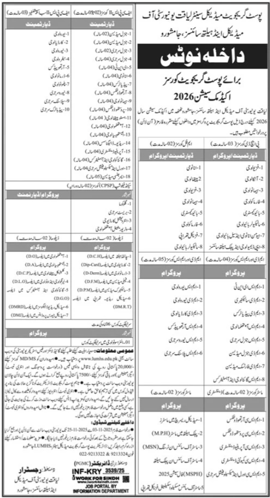 The Postgraduate Medical Centre, Liaquat University of Medical & Health Sciences LUMHS, Jamshoro, announces admissions for various Postgraduate Diploma, Master’s, MPhil, PhD, MD, MS, and Fellowship programs for the academic session 2026. The university continues its commitment to excellence in medical education, clinical research, and professional development across multiple health disciplines.