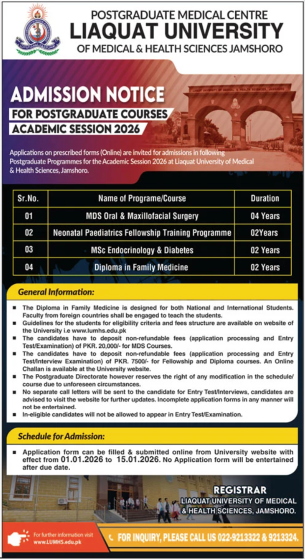 The Postgraduate Medical Centre at Liaquat University of Medical & Health Sciences LUMHS, Jamshoro invites applications for Postgraduate Courses for the Academic Session 2026. Interested candidates can apply online for the following programs: