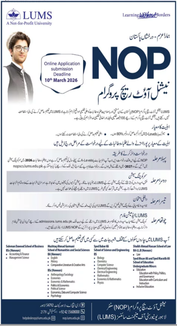 Lahore University of Management Sciences LUMS is committed to empowering talented students across Pakistan. Through the National Outreach Programme NOP, LUMS provides 100% scholarships and extensive academic support to deserving students who have the talent but lack financial resources.